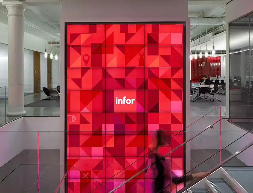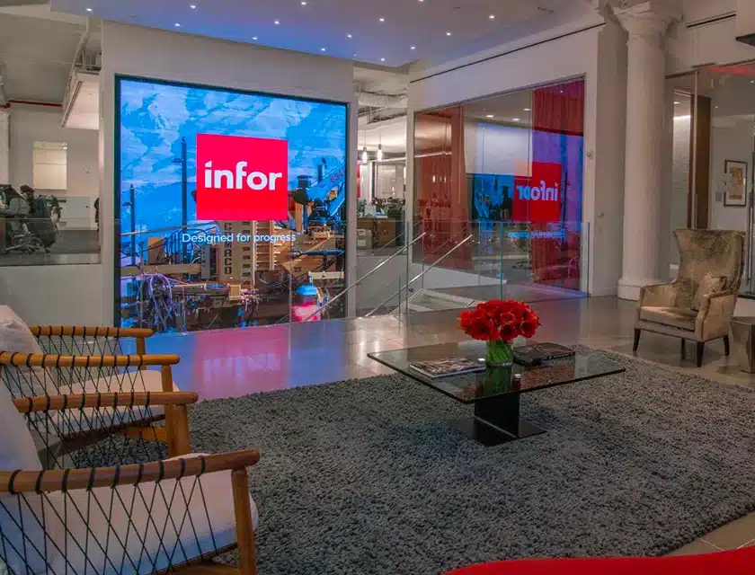 At A-V Services, we are proud to have partnered with Infor, a leader in enterprise software, to enhance their corporate headquarters in New York City. Our team was tasked with replacing an outdated LCD video wall in the lobby with a state-of-the-art Leyard TVF Series LED display, designed to create a seamless, visually stunning experience for visitors.