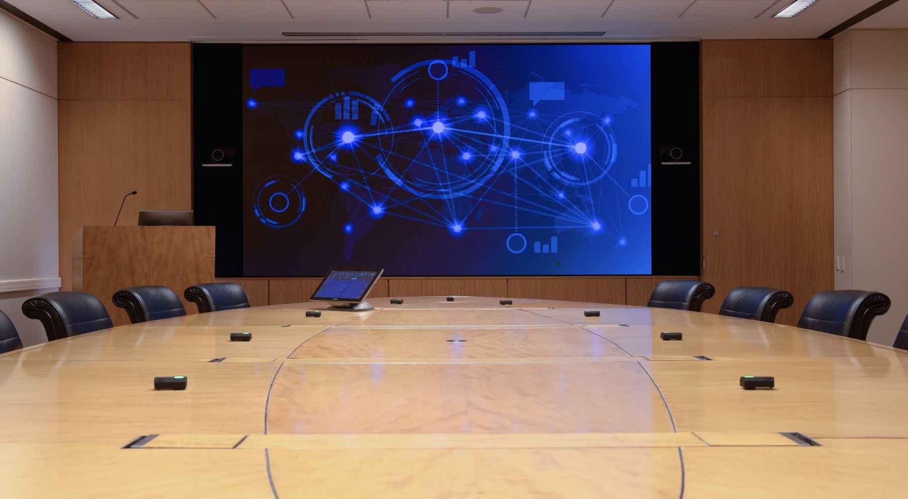 Recognizing the need for a significant upgrade, our senior account director, Pete Michetti, proposed an innovative redesign featuring the Planar® TWS Series LED video wall. The existing rear projection system was insufficient for the room’s beautiful 40-foot-long oval conference table, making it challenging for attendees to engage with presentations. Our design offered three pixel pitch options—1.5mm, 1.2mm, and 0.9mm—ultimately recommending the 0.9mm option to ensure optimal clarity for those seated just a few feet away.