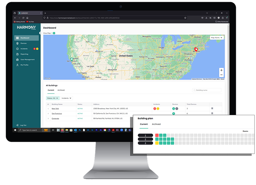 Monitor device conditions across all locations with color-coded floor plans and room statuses.